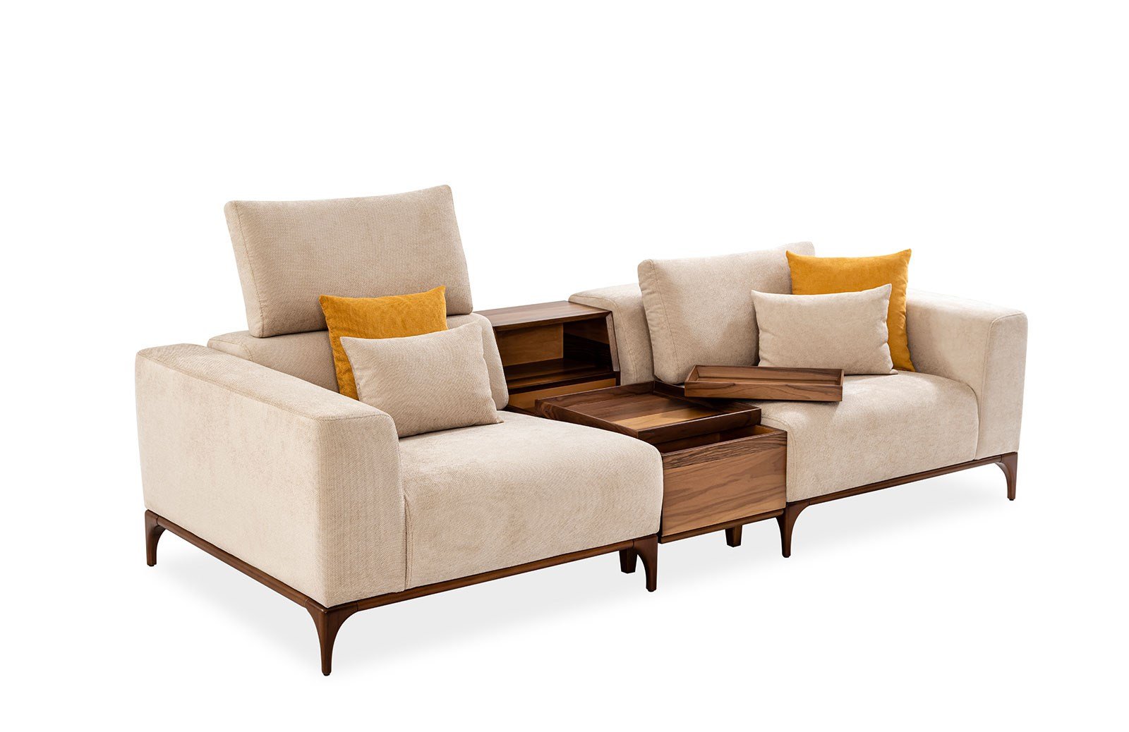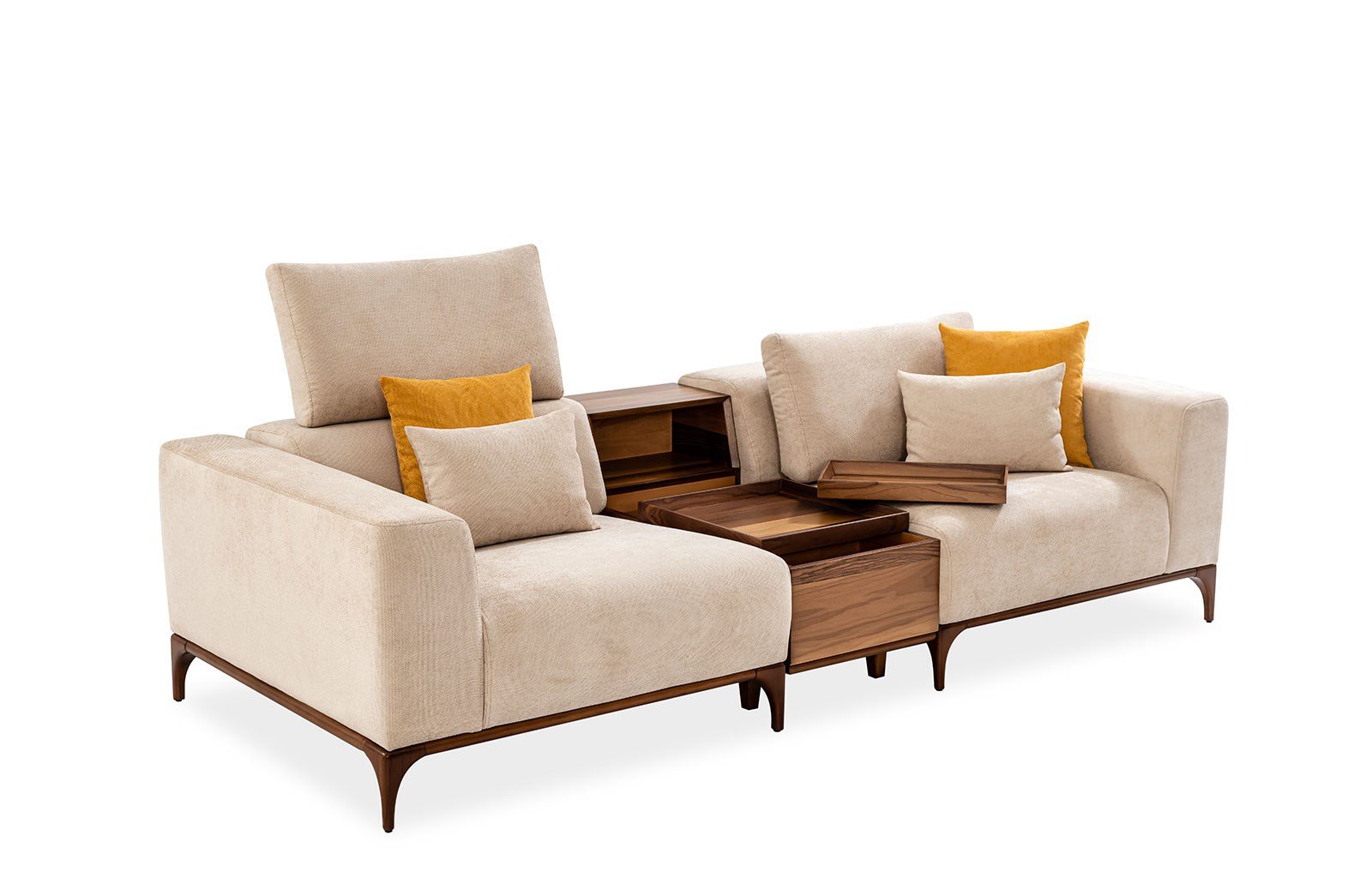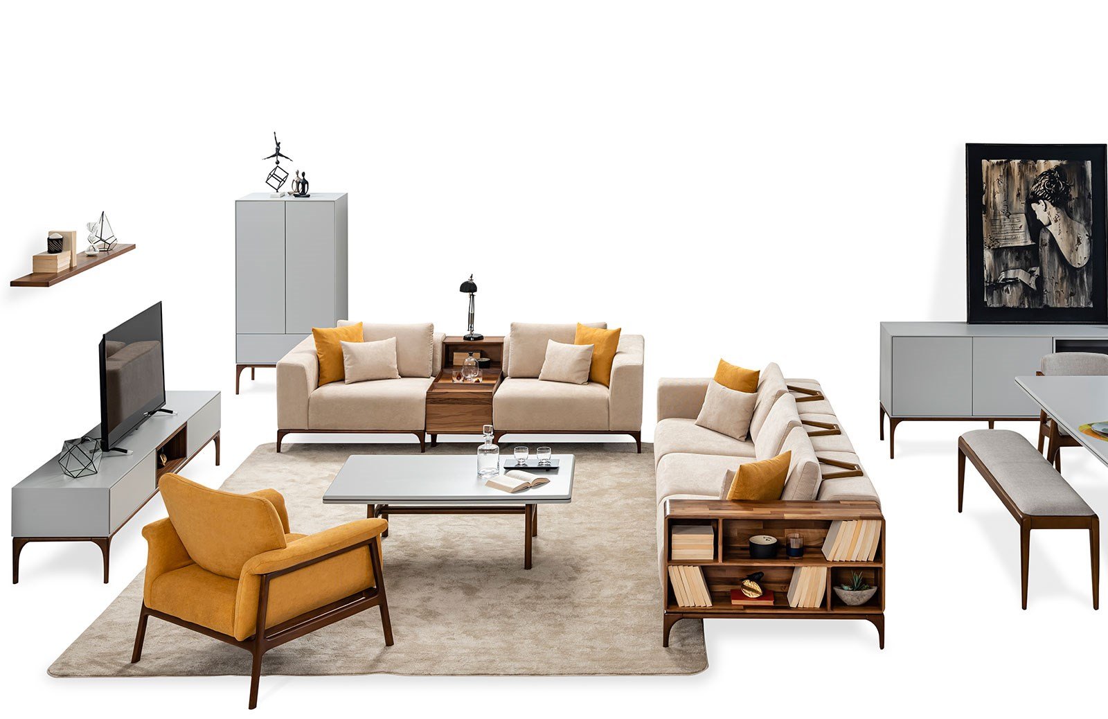 This modern sofa set features soft seating with high-quality Italian fabric and padded back cushions. The fixed seat cushions ensure comfort, supported by a plywood frame reinforced with steel. Elevated walnut wooden legs add elegance. Robot vacuum compatible, it does not offer fabric or leg color customization and is not available in special sizes.