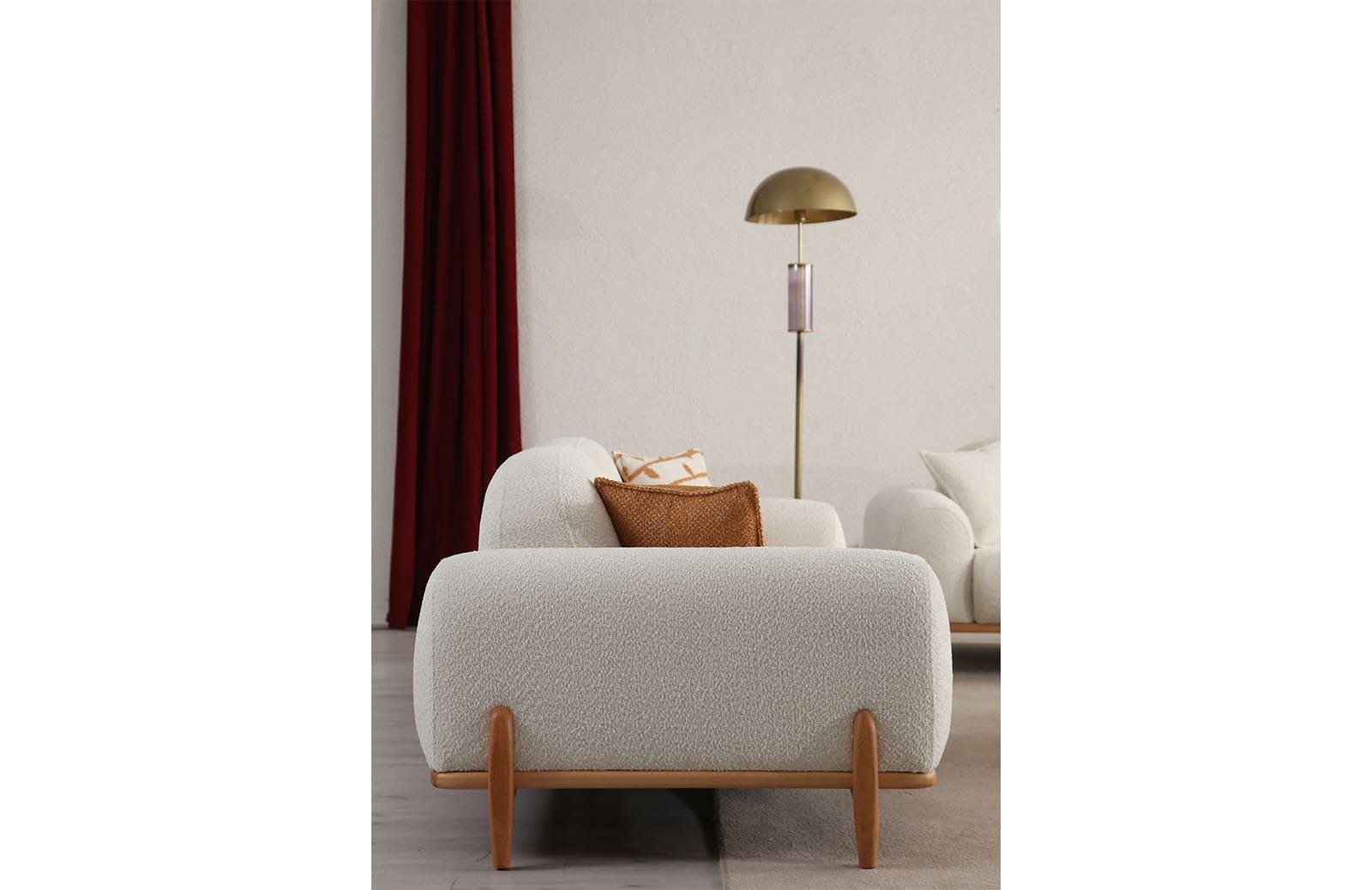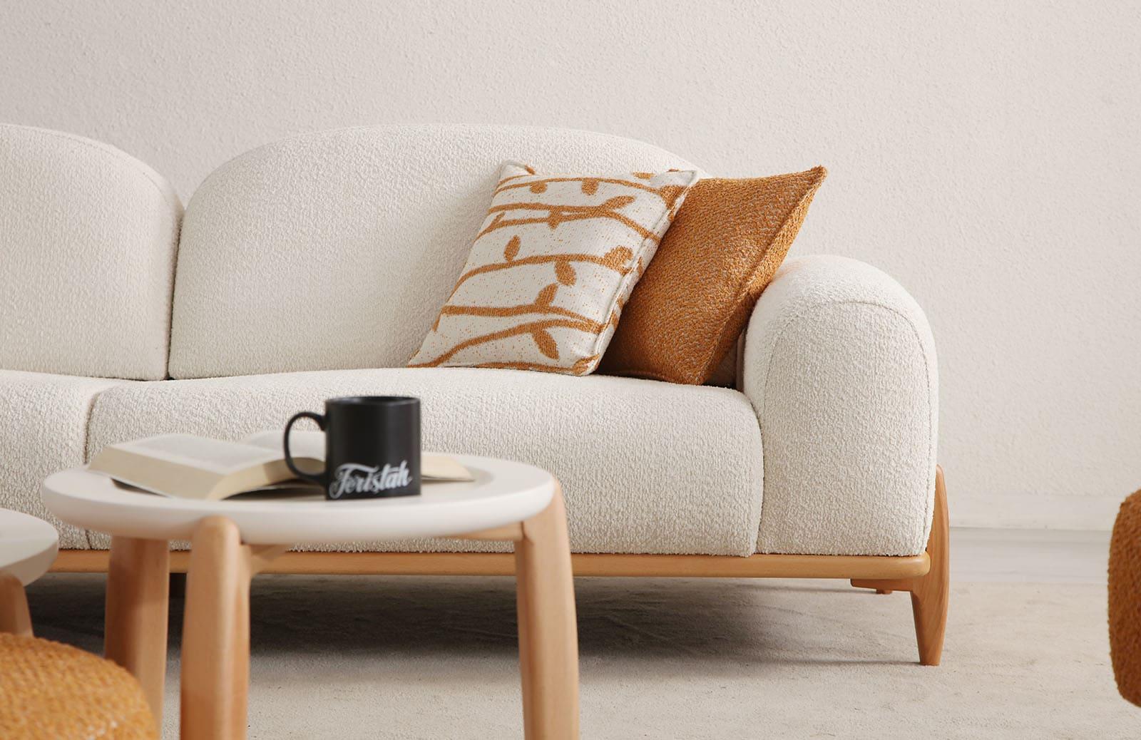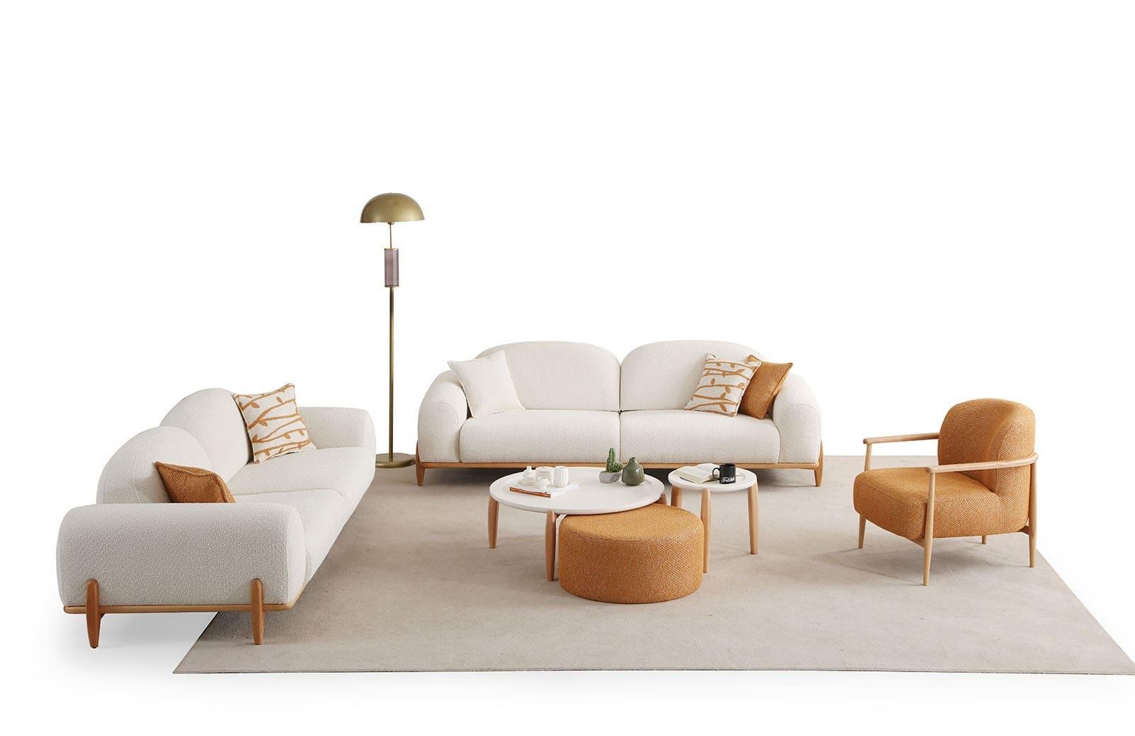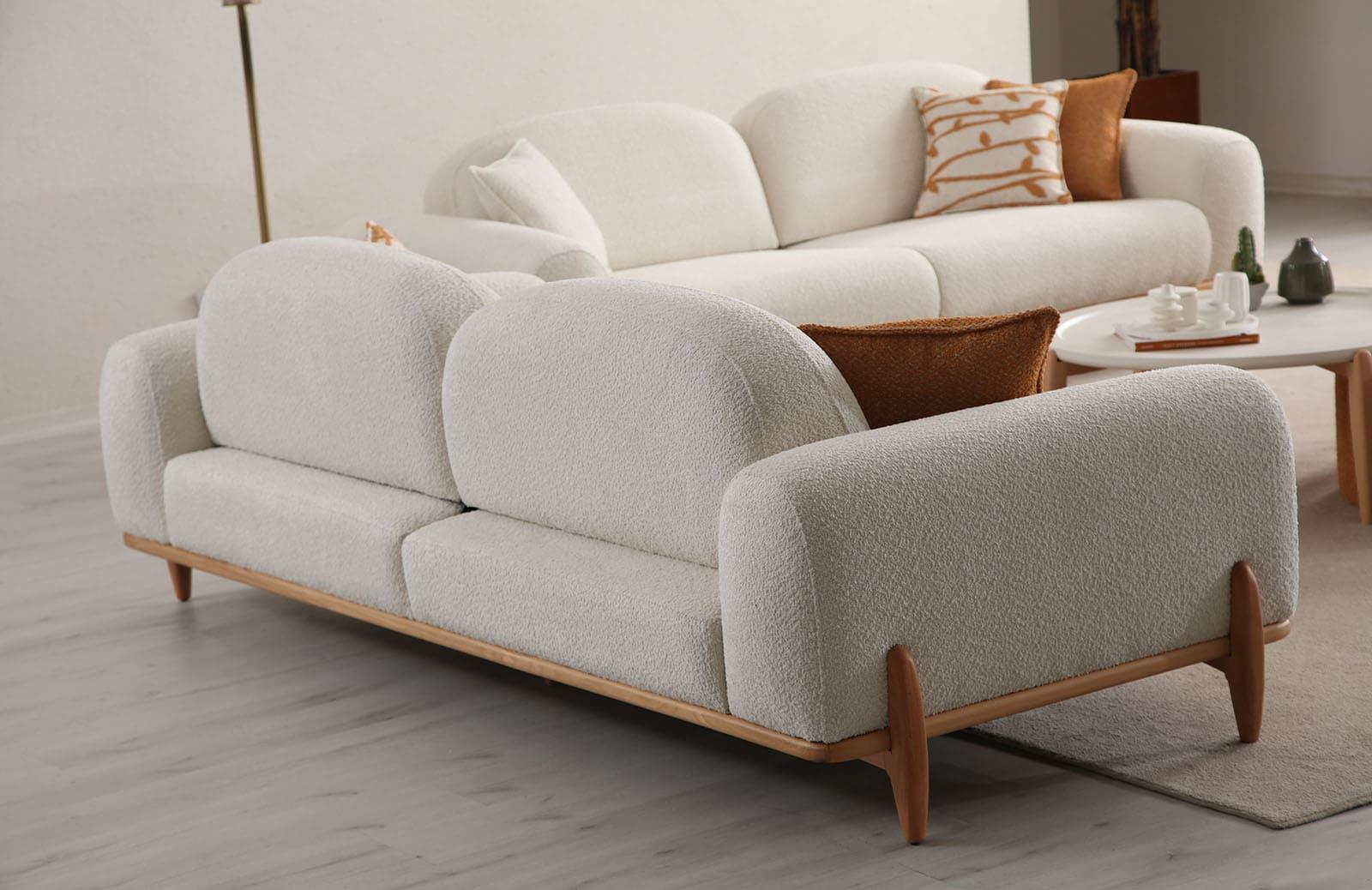 The sofa set contents include compatibility with robot vacuum cleaners. The fabric type is woven, with optional fabric selection available for an additional fee. The seating offers medium-soft comfort with fixed seat cushions and no back cushions. The legs are wooden, elevated from the ground, and available in a natural color with paid color options. The body material consists of hornbeam plywood, and the design is modern.