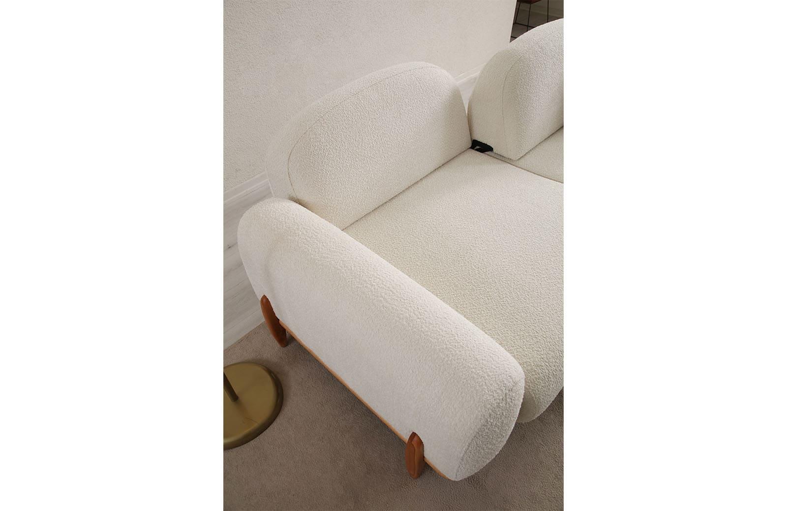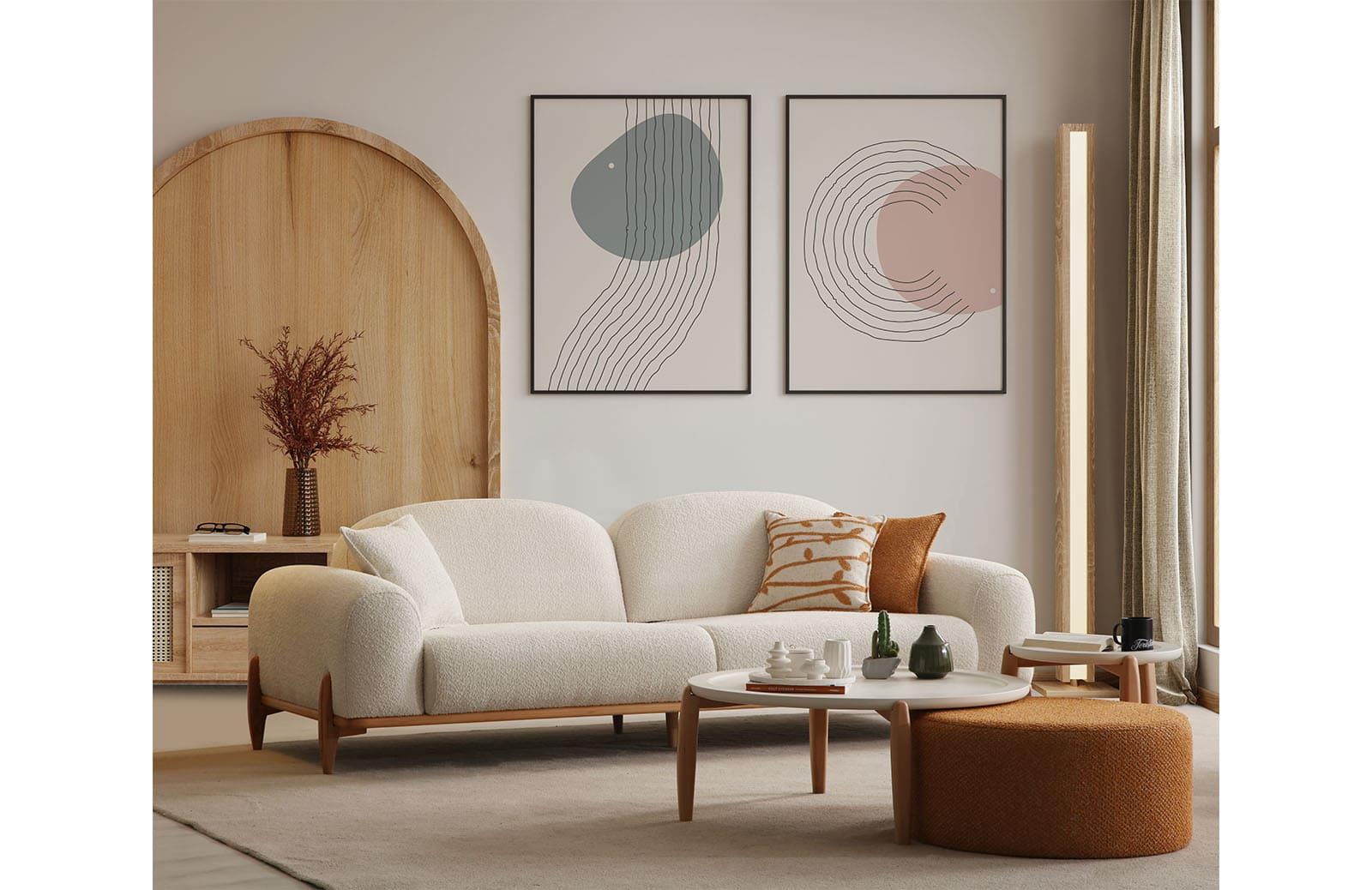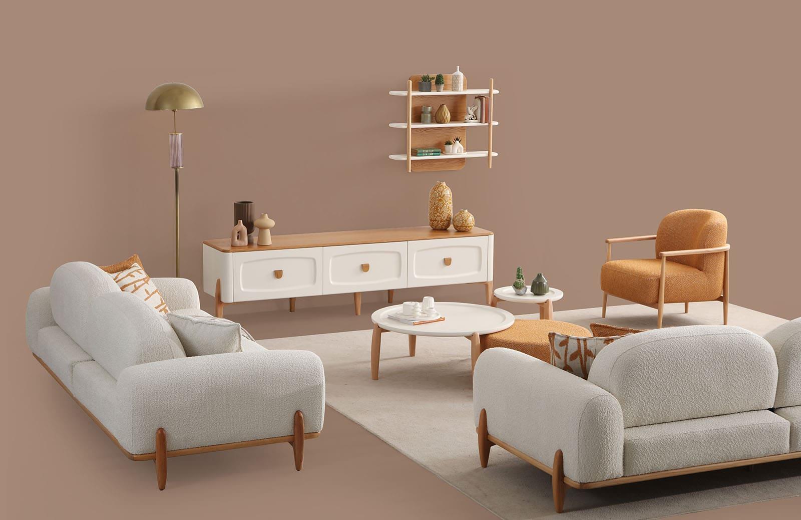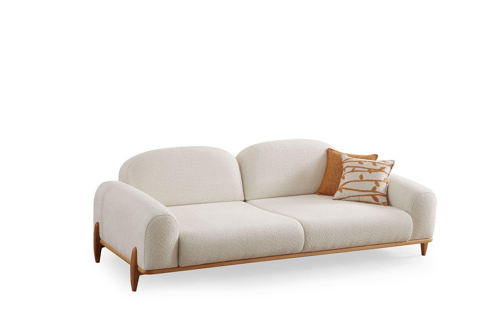 The sofa set contents include compatibility with robot vacuum cleaners. The fabric type is woven, with optional fabric selection available for an additional fee. The seating offers medium-soft comfort with fixed seat cushions and no back cushions. The legs are wooden, elevated from the ground, and available in a natural color with paid color options. The body material consists of hornbeam plywood, and the design is modern.