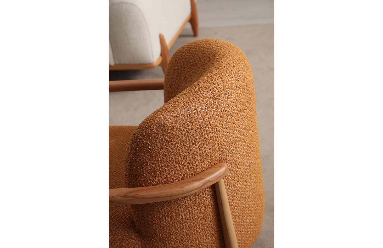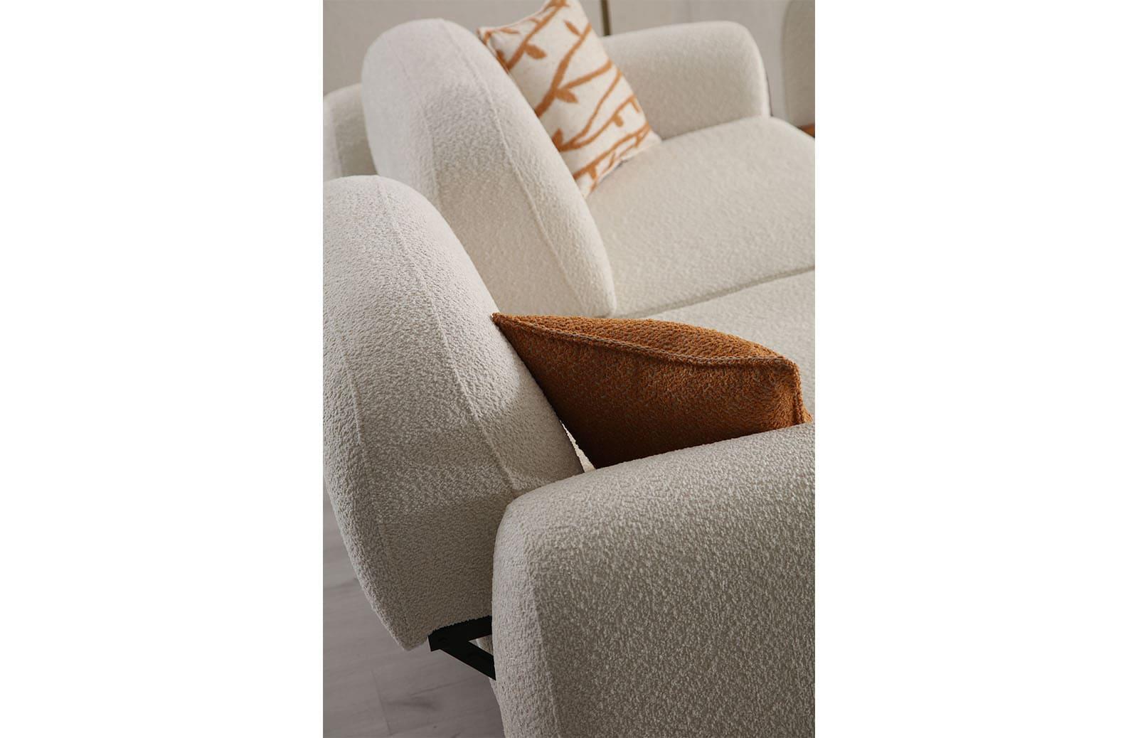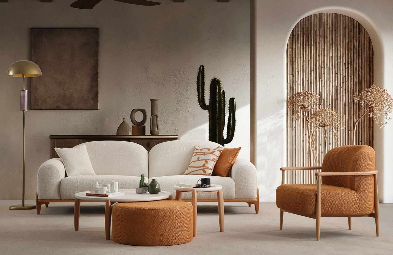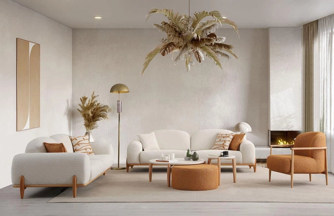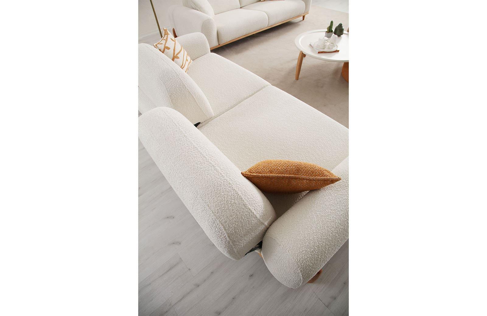 The sofa set contents include compatibility with robot vacuum cleaners. The fabric type is woven, with optional fabric selection available for an additional fee. The seating offers medium-soft comfort with fixed seat cushions and no back cushions. The legs are wooden, elevated from the ground, and available in a natural color with paid color options. The body material consists of hornbeam plywood, and the design is modern.